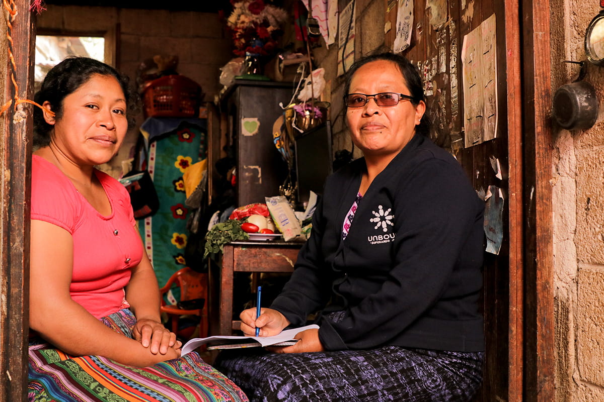 Irma (right), an Unbound social worker, pays a home visit to Nora, mother of sponsored child Cristel in Guatemala, where the family shares with Irma their troubles purchasing basic foods for weekly consumption.