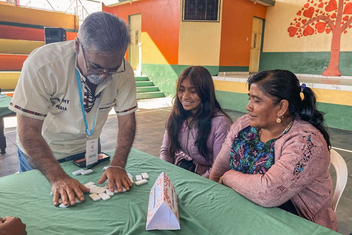 Unbound sponsor Jimmy Arreaga plays a game with his sponsored friend María Alexandra (center) and her mother Maria during an Unbound Awareness Trip to Guatemala in early 2025.